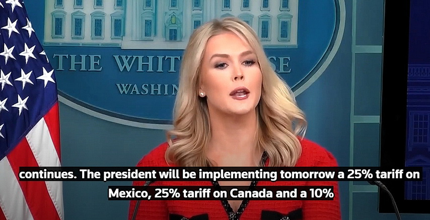 «Завтра президент введет 25%-ные пошлины для Мексики, 25%-ные пошлины для Канады и 10%-ные пошлины для Китая за нелегальный фентанил, который они закупили и разрешили распространять в нашей стране, что привело к гибели десятков миллионов американцев», — заявил Ливитт на пресс-конференции в Белом доме.