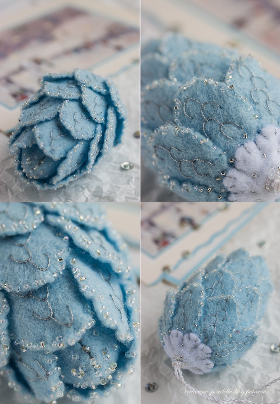 Ёлка у меня большая, влезает на неё много, так что я с очередной ёлочной игрушкой. Вся блестит и переливается. Мне даже сложно сказать чего в ней больше, фетра или бисера.
