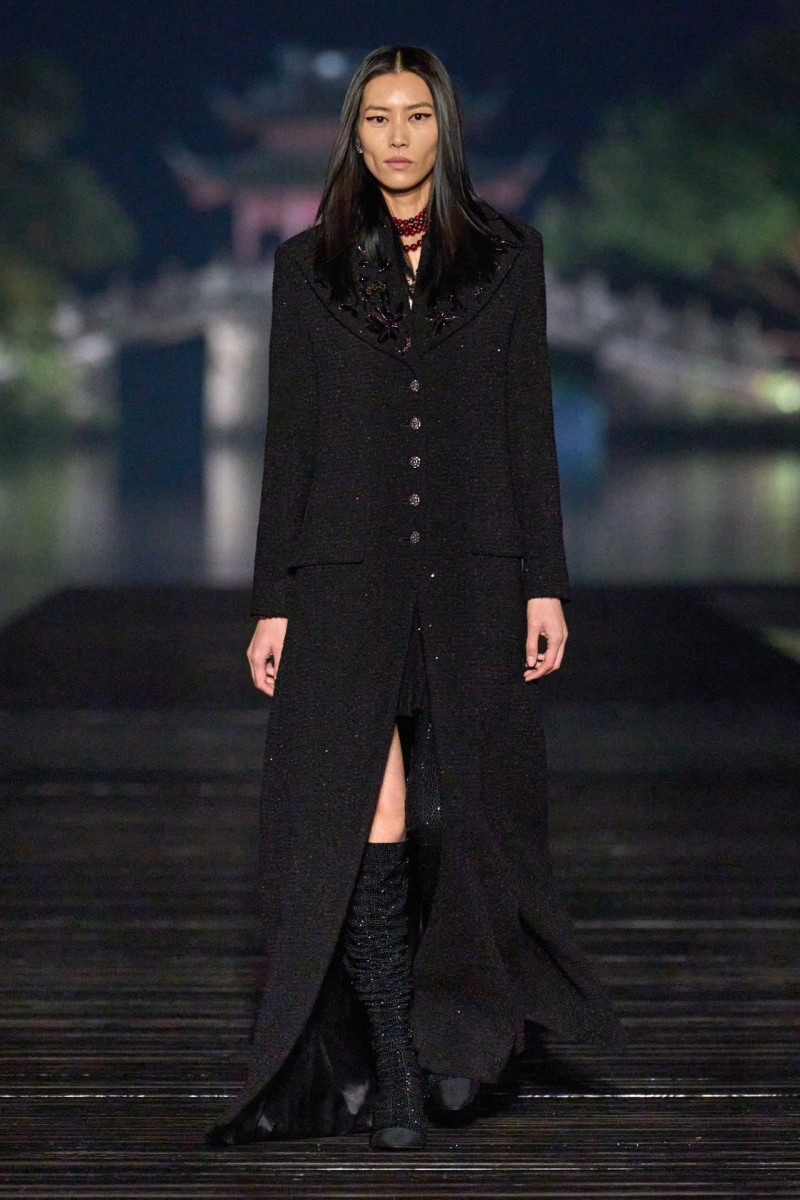 Шоу прошло в Китае, отчего не удивительно, что часть коллекции отсылает к китайской культуре. Например, золотисто-желтый брючный костюм, платье-комбинация и ботфорты того же оттенка — желтый в Китае считается цветом императоров. А также костюмы с брюками и бомберами, юбки и плотные блестящие колготки, с принтами в виде одних из главных образов китайской живописи — цветов и птиц. В остальном же, Chanel остались верны себе и твиду.