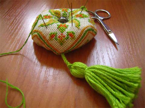 Бискорню - французское слово, которое переводится как многоугольник, кривуля. Бискорню представляет собой подушечку с несколькими неравными углами, однако довольно симметричную, и может служить игольницей. Если ее красиво украсить, то такую вещичку будет красиво повесить даже на елку. Это очень красивая и элегантная вещица, а также прекрасный подарок.