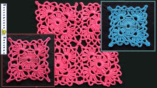 Ажурный квадратный мотив с веерными элементами, расположенными по углам квадрата. Соединение мотивов происходит во время вязания.