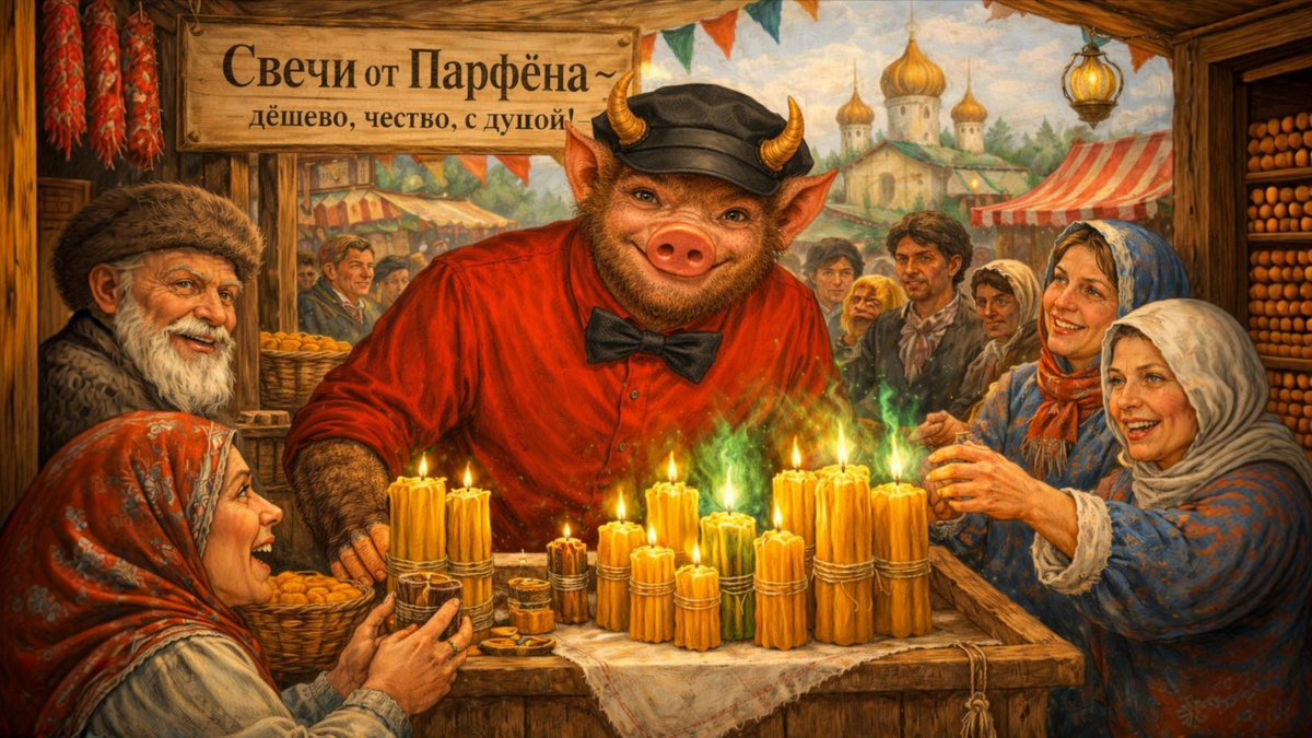 В субботу, накануне ярмарки, на площади появился новый лоток. Аккуратный, с белой скатертью, с надписью на фанерке: «Свечи от Парфёна — дёшево, честно, с душой!». За прилавком стоял приветливый господин в красной рубахе, картузе и при галстуке-бабочке. Улыбался так, что хотелось немедленно что-нибудь у него купить.