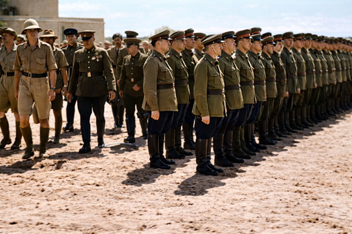 Генерал-майор В. В. Новиков и бригадный генерал У. Р. Тиркс инспектируют войска перед совместным советско-британским военным парадом в Тегеране, в сентябре 1941