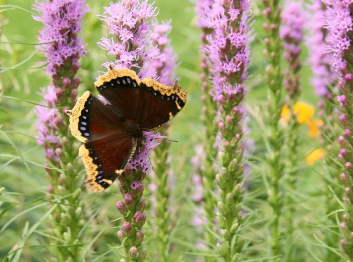 Редких 6а6очек, таких как вот эта траурница, привлекают яркие цветы. Бабочкам нравится пить их сладкий нектар.