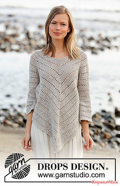 Связанный крючком джемпер-пончо с регланом в цвете DROPS Sky. Изделие связано крючком сверху вниз под углом, А-образной формы и кружевным узором. Размер XS – XXL.