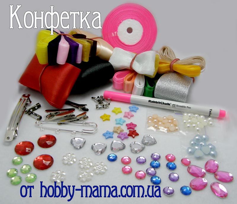 Конфетка состоит из отрезов лент(атласные, органза и парчевая) от 2 до 4 м. каждый, рулон розовой ленты 0,5см, полужемчуга, пришивных камней, заготовок для брошки и заколок, декоративных пуговичек и самоисчезающего маркера для разметки лент(и не только).