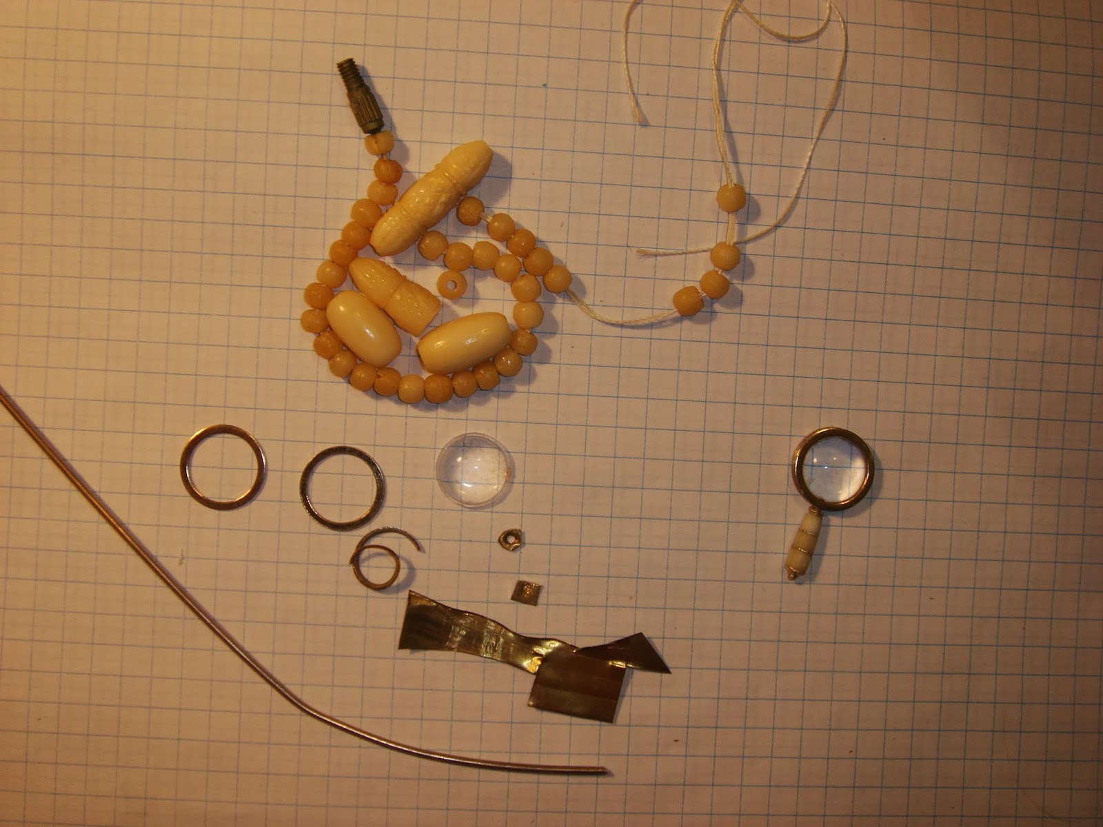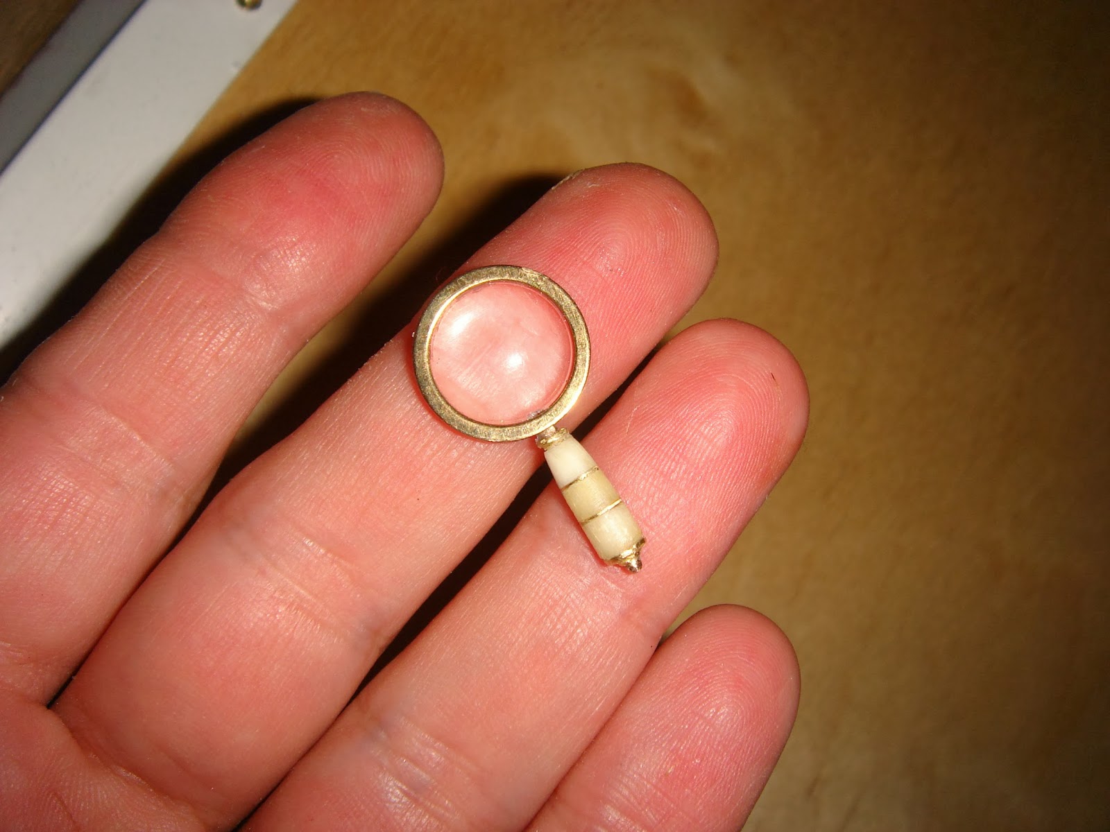 Линза от маленького фонарика. Ручка сделана из трех обточенных бусинок, которые одеты на латунную проволоку. Между бусинами латунные вставки. Все очень просто.