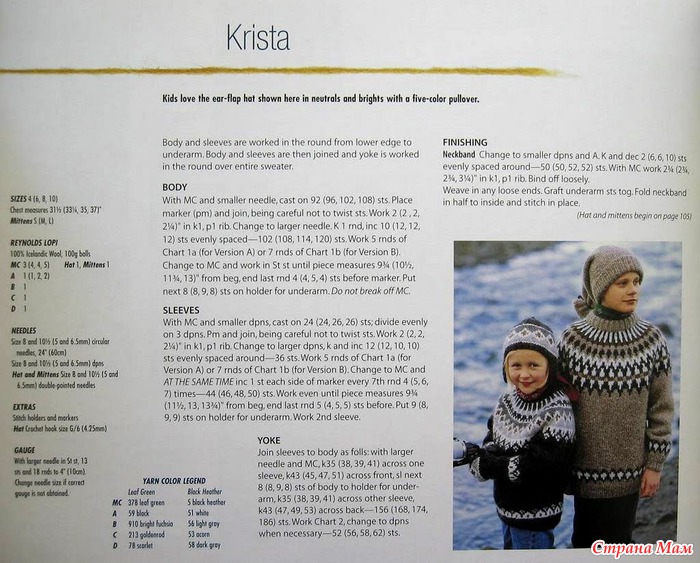 Вам потребуется : Пряжа «Lett Lopi» (100 % шерсть, 50 г /100 м): 400 г цвета деним (цвет №9418). 150 г белой (цвет №0051), по 100 г серой (цвет №0056) и черной (цвет № 0005); круговые спицы №3,5 и №4,5.