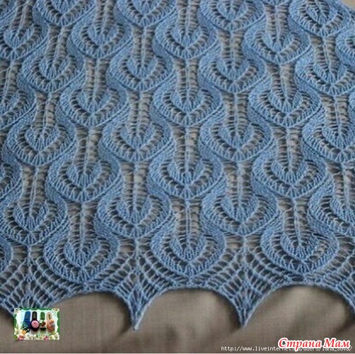 В схеме указаны лицевые ряды. В изнаночных рядах вязать по рисунку ( кроме петель, выделенных голубым цветом), накиды вязать изнаночными.