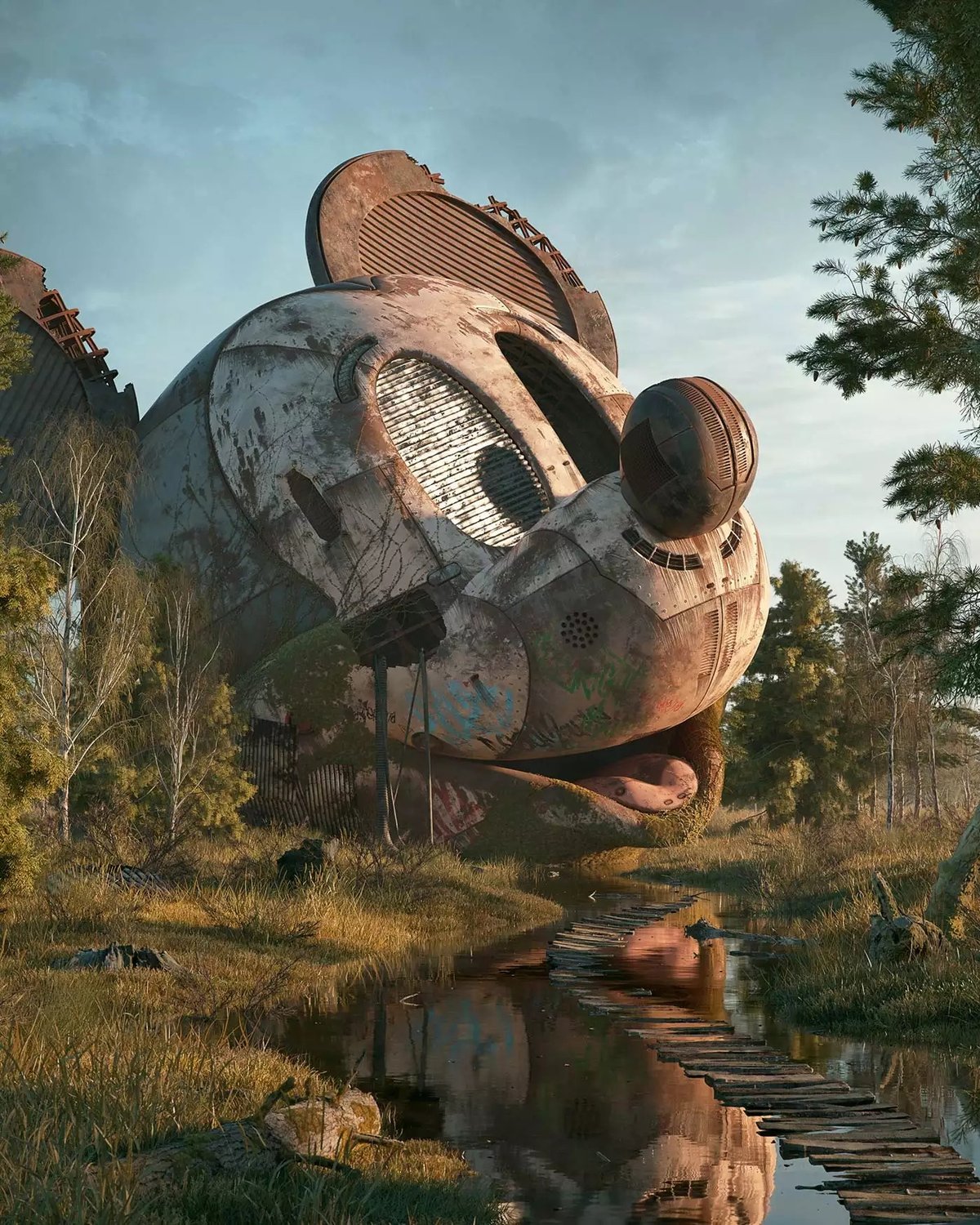 Чешский 3d-художник Филипп Ходас создаёт странные и сбивающие с толку изображения не принадлежащие сегодняшнему времени, а словно смотрящие на нас из невесёлого будущего. От сгнившего под заброшенной эстакадой Спанч Боба и умершей среди каменной пустоши Хелло Китти, до покрытого лишайником Каонаси в руинах буддийского храма, и дома-упаковки Макдоналдс в окружении русских берёзок — художник использует широко известные визуальные образы персонажей аниме, видеоигр, брендов фастфуда, и другие узнаваемые изображения, которые заполняют собой окружающий пейзаж поп-культурной дистопии, вызывая противоречивые ощущения ностальгии и мрачного предчувствия.