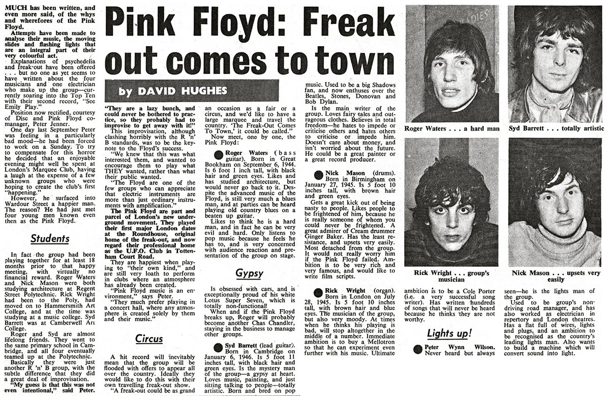Охренительно забавная газетная статья о Флойдах. Это уже не безвестные парни из Политехникума с Риджент-стрит. Группа успела поменять название с THE PINK FLOYD SOUND, для начала избавившись от «SOUND», а позже выкинув и определённый артикль. И сами они уже не себе на уме, а с менеджментом в лице Дженнера и Кинга. Дэйв ещё не в их бэнде, а пилит каверы с группой JOKERS WILD. Сид, пока в здравом уме, вовсю рулит командой, и на концертах, к восторгу публики, разбрасывают розовое желе — прямо по традициям тогдашних хеппенингов. А за «фирменный» сидовский перенасыщенный ревербераторами и фидбэками гитарный саунд, их люто терпеть не может провинциальная публика. Хотя модное слово «психоделия» уже вовсю использует столичная молодёжь и прогрессивные музыкальные журналисты. Но широкой публике они по-прежнему малоизвестны, и нуждаются в представлении своих скромных персон. Умопомрачительные световые шоу ещё впереди, как и альбомы с миллионными тиражами. Всё только начинается!..