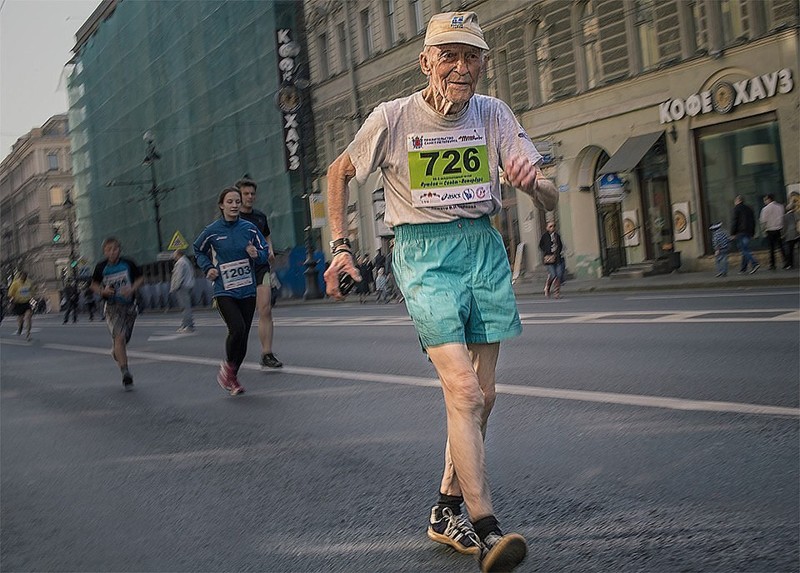Питер. Он бежал, а за ним тихо ехала скорая, рядом шла медсестра... Народ останавливался и аплодировал... И он бежал. Этот ветеран - защитник Ленинграда, переживший блокаду, один уже из немногих, кто выжил и победил.