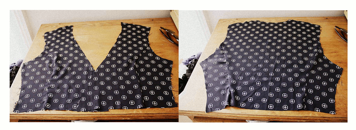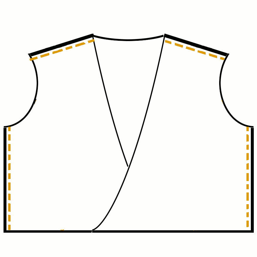 С правой стороны внутрь, сшивать куски вместе, на плечах и по бокам, вдоль пунктирной линии. Отложите на минуту.