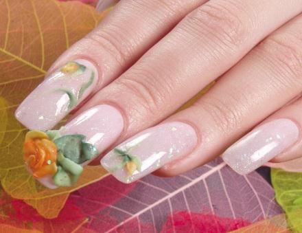 Для работы потребуются мономер, нежно-розовая пудра с блеском и эффектом тумана и любая прозрачная пудра с блеском в тон (для собственно наращивания), кисть для работы с акрилатами, а для изготовления цветов – пудры нежно-персикового,оранжевого, темно-зеленого и салатового цветов. Также понадобится немного глиттера. До начала наращивания необходимо выполнить стандартные процедуры, подготавливающие руки к процедуре наращивания: обработать руки антисептиком, запилить ногти, обработать и отодвинуть кутикулы, подготовить и приклеить на ногти типсы (или установить формы). Затем обработать натуральный ноготь праймером (или, в зависимости от выбранной системы, пре-праймом и праймером), на ноготь и/или типс нанести подложку из прозрачного акрила. Далее можно приступать к