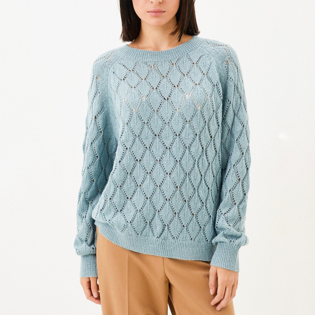 Джемпер выполнен уже слегка поднадоевшими ажурными листиками. Но всё равно обращает на себя внимание. Возможно, что эффектность изделию придаёт нежно-голубой оттенок пряжи, дополненный легкими сияющими пайетками.