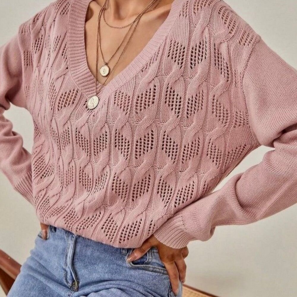 Первый топ - новинка онлайн-магазина Shein. Состав пряжи в этой модели - объемная синтетика: 55% вискоза, 27% полиэстер, 18% полиамид.