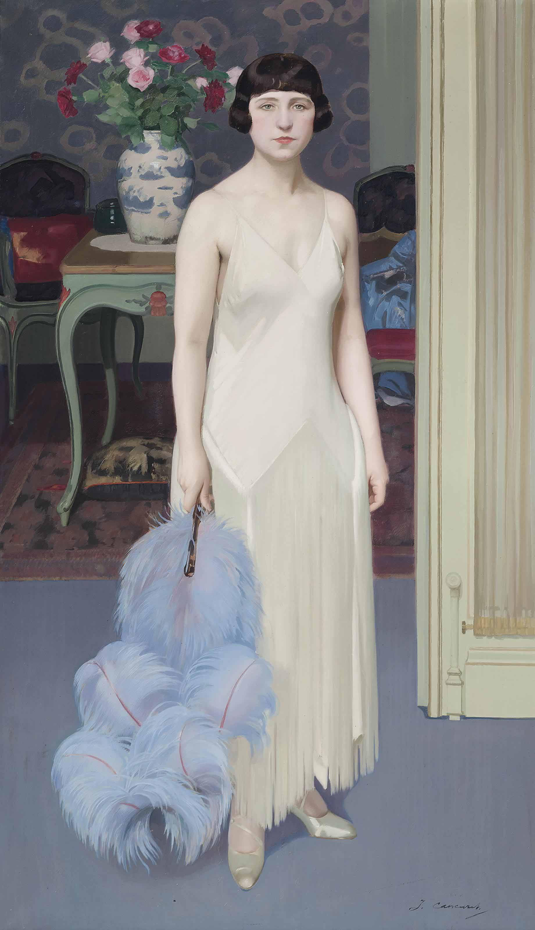 A portrait of a lady in a white dress with a pink sash by a balustrade