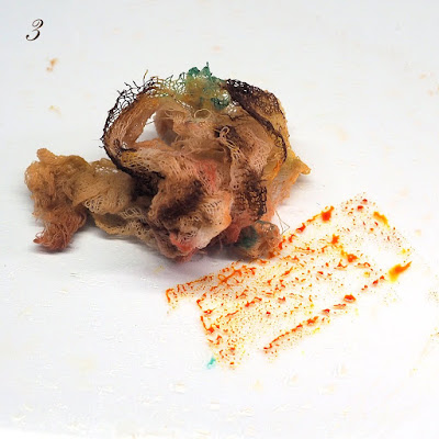 Все прядки выкладываем вдоль оси шарфа (по горизонтали). Сверху по горизонтали выкладываем тонкие прядки шерсти. Так же как и вискоза, прядки шерсти слегка идут в нахлёст. Чередуем оранжевую и жёлтую шерсть. На фоне оранжевой зари встаёт жёлтое солнышко. Можно выложить только блики солнца. При выкладке солнца часть прядок шерсти, выложили по кругу. Это важно!!! Если хотите усадки по прямой (получить ровный шарфик), то прядок по кругу солнышка выкладывать не надо. У меня такая выкладка дала небольшой воротничок на шарфике. Сверху на шерсть выкладываем шелковые волокна Малбери.