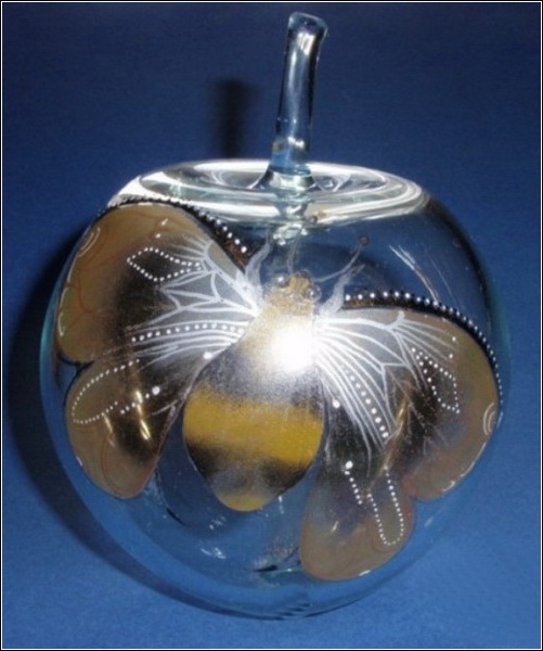Небольшой извив, и стеклянная сфера превращается в невесомое яблоко. Но это прозрачное чудо лишь холст для петербургской художницы Евгении Вихровой. Выполненная вручную декоративная роспись, преображает хрупкую вещицу в великолепную картину с прекрасным сюжетом. Изящные стеклянные миниатюры Евгении Вихровой радуют глаз и трогают сердце. Среди множества работ особо выделяется серия «яблочных» произведений. Они все похожи — но каждое уникально. Используя широкую гамму цветов художница создаёт детальные сюжеты, которые часто объединяет в особые композиции (например времена года или цветы). Благодаря сочетанию оригинальной формы и красивой декоративной росписи получается чудесная вещь, которой можно любоваться часами (а в крайнем случае съесть, если у Вас алмазные зубы...).