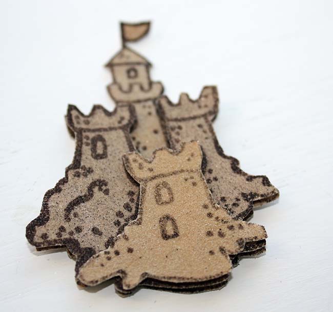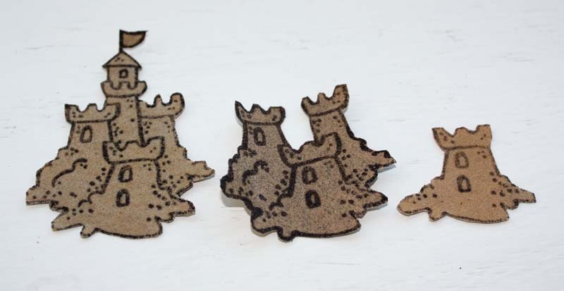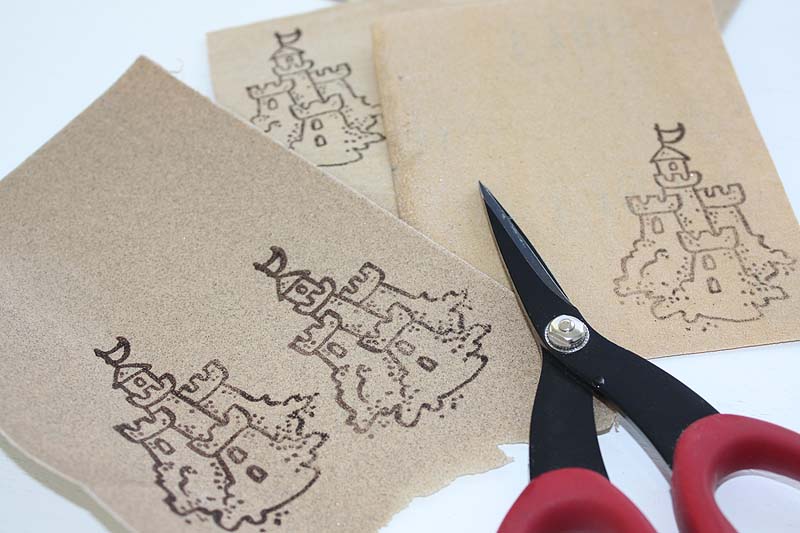 Думаю почти в каждой квартире или доме найдется наждачная бумага. Вот, как видите, самое главное и трудное уже вам рассказано :) А теперь, или сами от руки рисуете песочный замок, или у вас по стечению счастливого случая есть штампик замка, печатаем чернилами Стазон 3-4 оттиска.