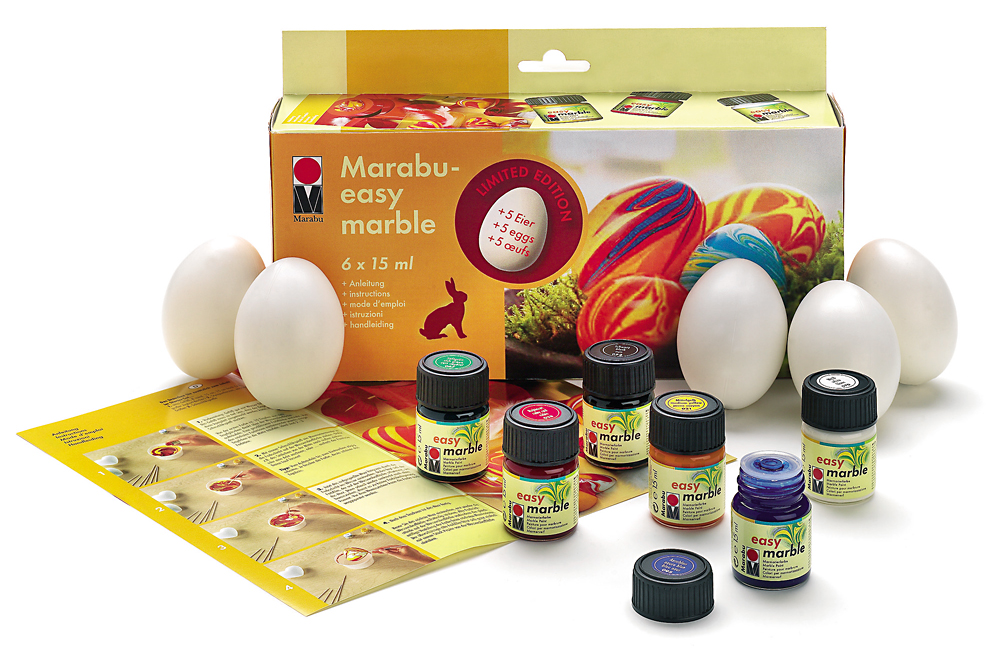 Для освоения техники воспользуйтесь набором красок Marabu Easy Marble, включающий 6 цветов: белый, синий, желтый, красный, зеленый, черный.