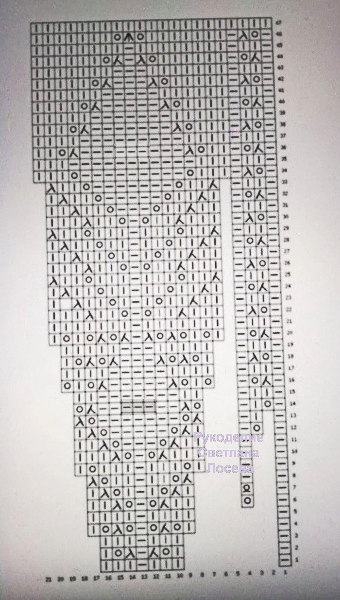 Раппорт узора состоит из 8 петель и 20 рядов. Четные ряды вязать по рисунку. Для вязания узора поворотными рядами набрать количество петель кратное 8 + 2 кромочные. Описание узора: 1 ряд: кром., * 2 лиц., 4 изн., 2 лиц.*, кром. 2 ряд: кром., *2 изн., 4 лиц., 2 изн.*, кром. 3 ряд: как 1 ряд 4 ряд: как 2 ряд |