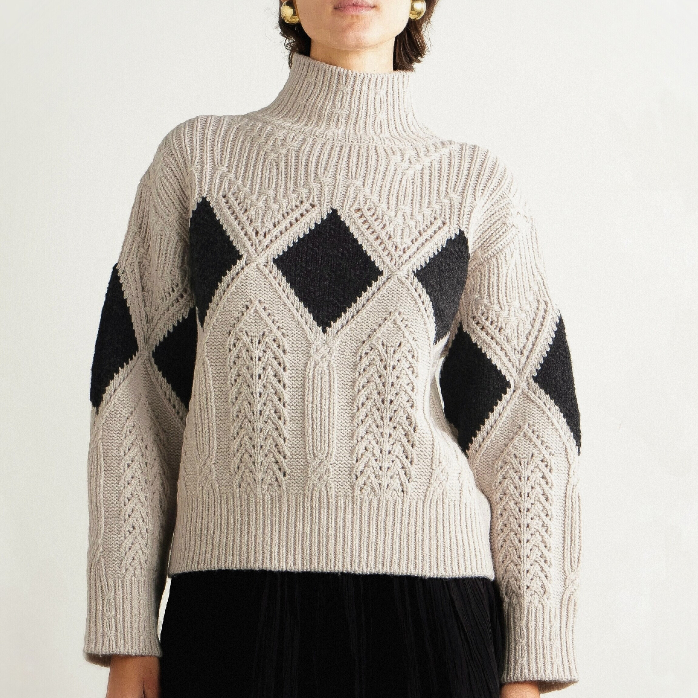 Перед вами свитер из 100% монгольского кашемира. В кашемире даже несложные узоры смотрятся очень красиво. Из-за состава свитер мягкий, пластичный. При этом вещь не обязательно вязать только из 100% кашемира. Можно использовать смесовку с мериносовой шерстью и кашемиром, чтобы получить бархатистую фактуру, как в оригинале.