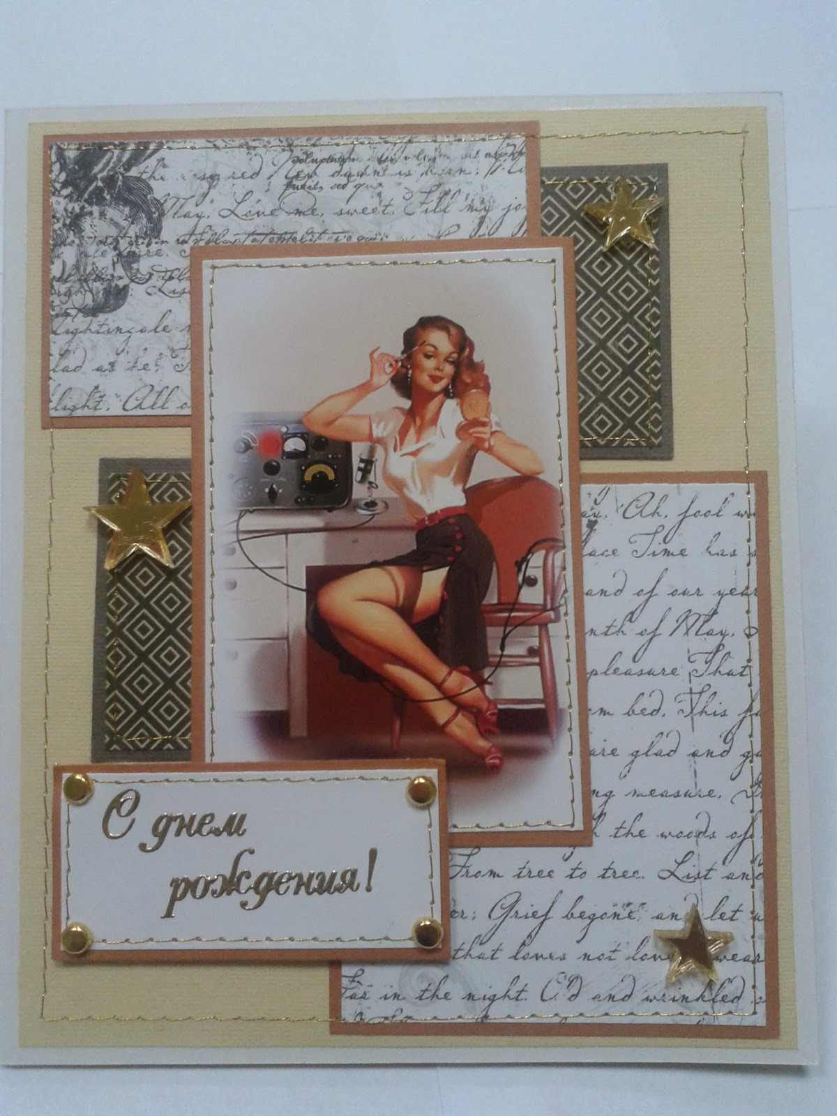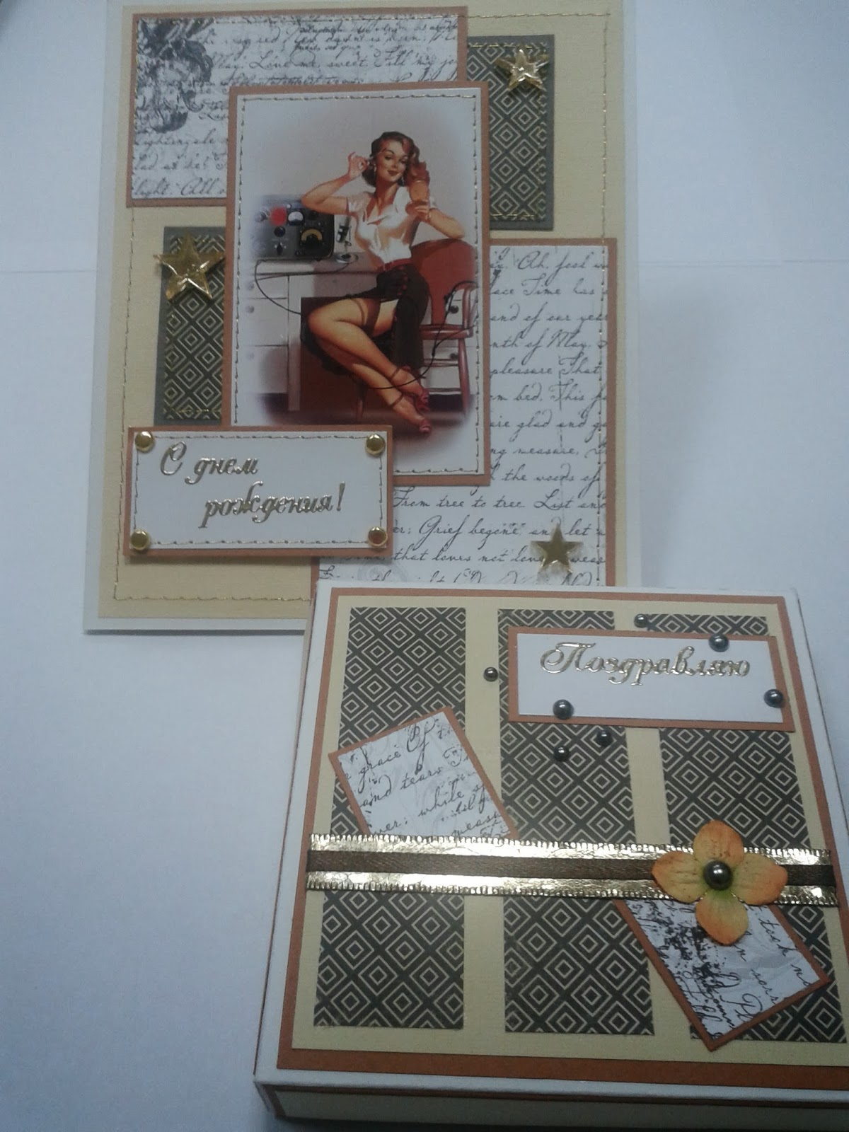 Сделала для своего начальника открытку с коробочкой к дню рождения. Это открытка поближе. Использовала свою любимую тему, пин-ап картинки.