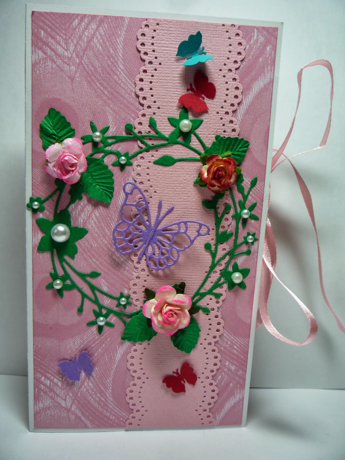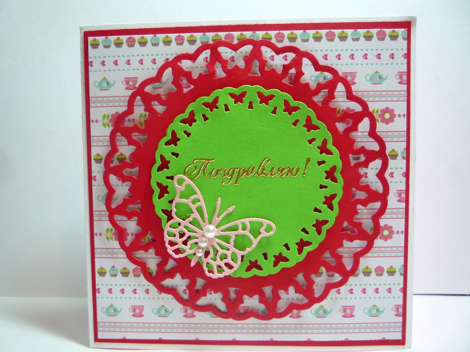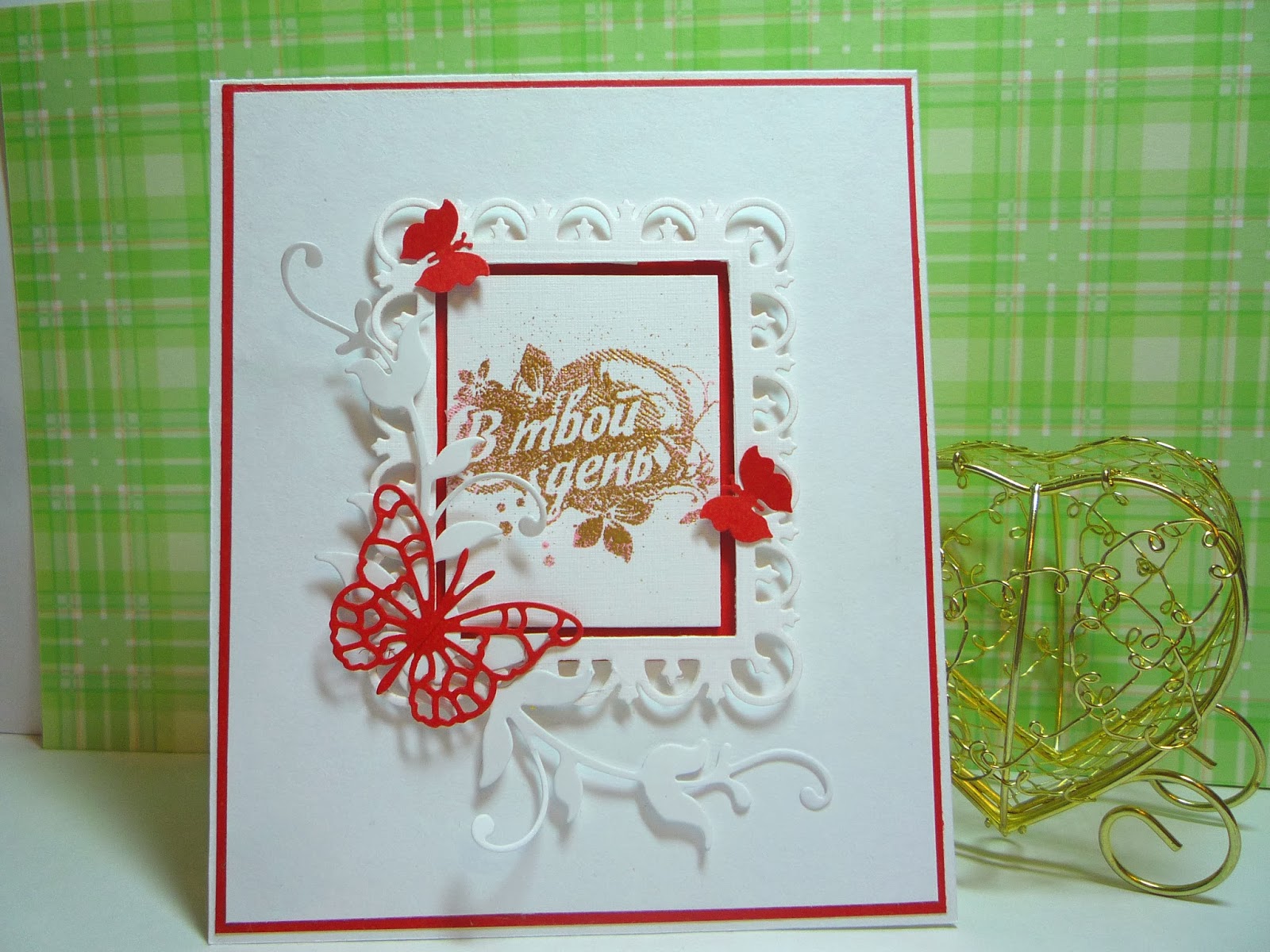 Эта открытка так же с использованием этих ножичков. И добавлена бабочка (тоже нож для вырубки). Не давно обратила внимание, что как у меня появился БигШот я стала реже пользоваться дыроколами.