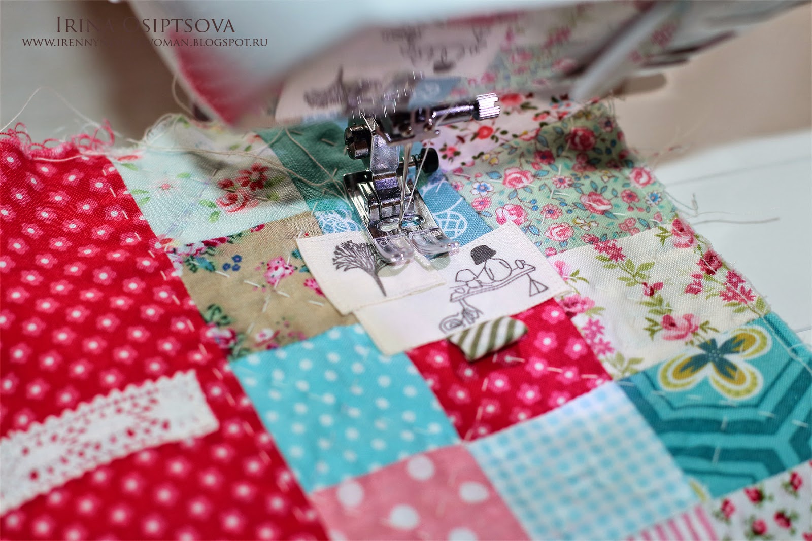 4. Украшаем нашу лицевую часть. Я простегала ее вручную и пришила этикетки и кусочек кружева.