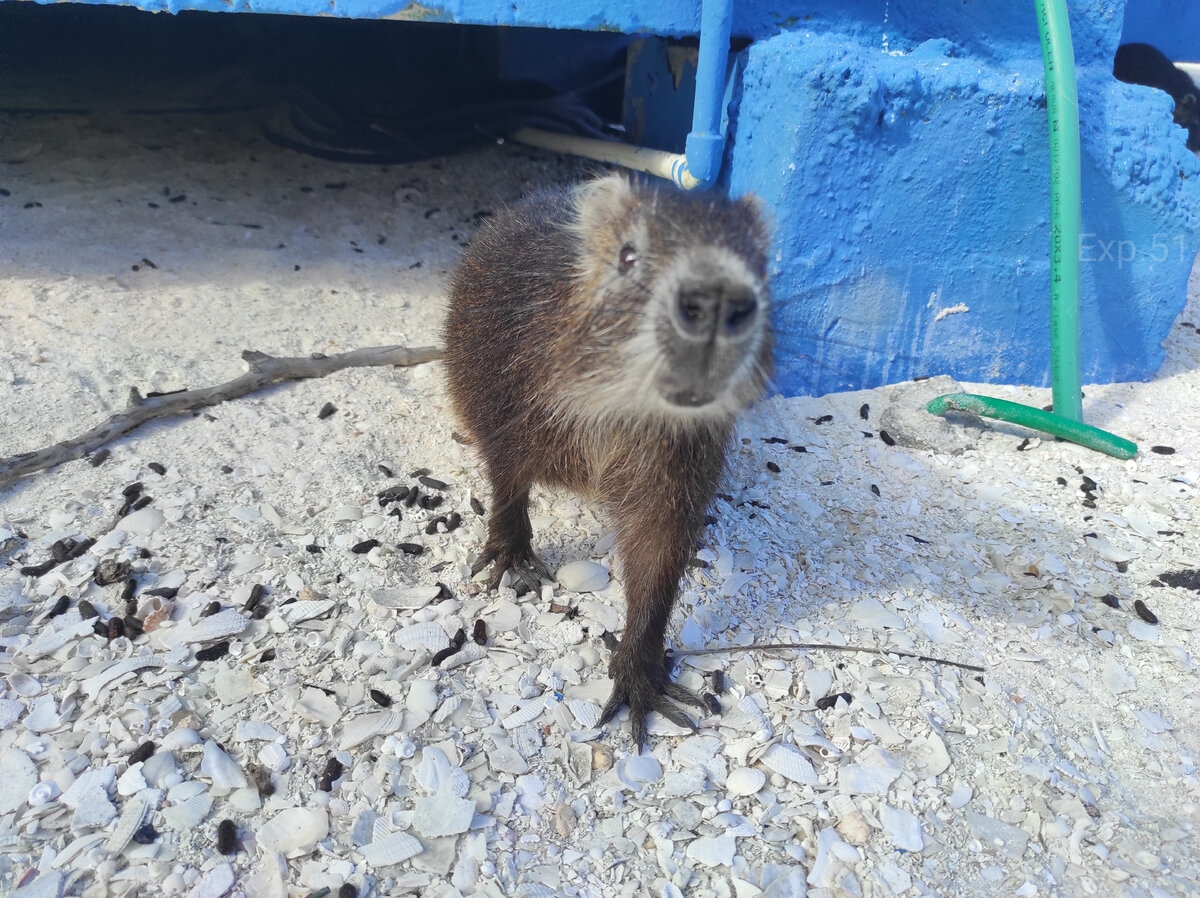 Зверюшка действительно очень похожа на капибару. Тело приземистое, лапки короткие, голова тяжелая, ушки мясистые. Идеальная форма, одним словом. Только в отличие от самого большого грызуна в мире, кубинский копипаст весит как небольшая собачка — 4-6 кг веса и 60 см длины. А ещё очаровательный вид немного портит голенький, покрытый редкой щетиной хвостик, выдавая принадлежность хутий к семейству щетинистых крыс. Но можно ведь на корму и пореже смотреть. Тем более что у этих зверьков такая мимимишная мордочка.