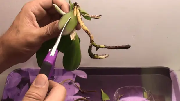 Этой орхидее отчасти повезло, у нее есть несколько воздушных корешков. С субстратными корнями дело обстоит иначе, они практически все сгнили или высохли и подлежат обрезке. Обрезать корни следует как можно ближе к основанию, не оставляя пеньков.