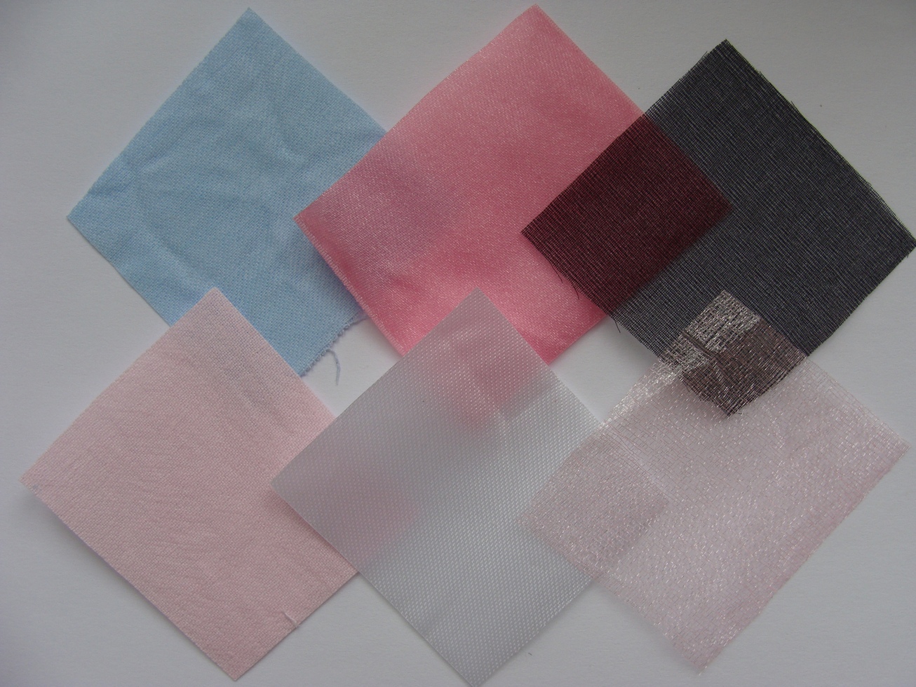 Для гортензии нам потребуется нежная тонкая ткань с плотным переплетением нитей, непрозрачная. Можно взять шелк – натуральный или искусственный (белый), я взяла перовой тик (светло-розовый, голубой), широкую атласную ленту (розовая). Ткани совсем непохожие, но цветочек будем делать именно из тика, поскольку он оказался жесче и прожилки хорошо прочерчиваются. На фото также присутствует розовая и черная органза. Из этой ткани цветочки не получатся, так как она практически не поддается тиснению. Эта ткань хороша тем, что после пропитки желатином она не осыпается. Атласная лента тоже плохо теснится.