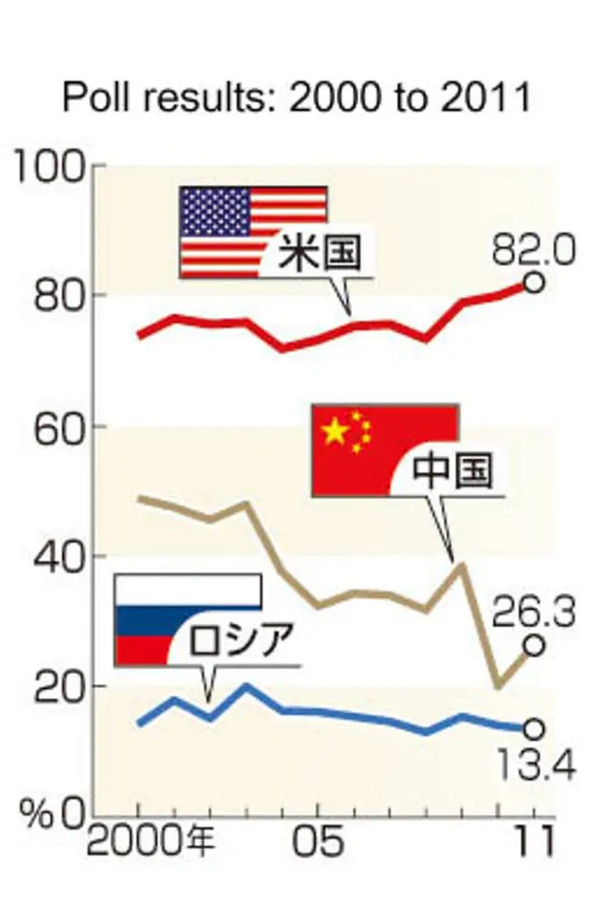Ну, вот вам тогда такая диаграмма. Хорошее отношение японцев к этим странам — с последней отсечкой в 2011 году. За эти десять лет кардинально, конечно, ничего не изменилось, наоборот, для нас — все только усугубилось.