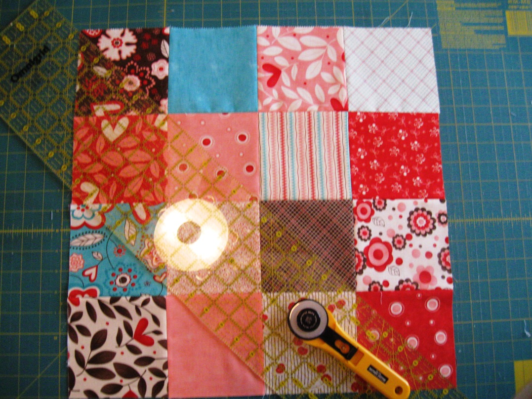 Grab your first 16 patch block that you made in the last step. Lay it out on your mat. Don't worry to much about lining it up, it doesn't matter. Now, if you have a yard stick it will probally be easier to use. Unfortunately, I don't own one. Crazy, I know. If you don't have a yard stick use your long ruler and another ruler lined up together. Lay your ruler diagonally across your entire block. You want to try and make sure that your ruler is intersecting each of the corners. Make sure to really smooth your corners out, they will want to creep in on you :) Once you are all lined up, go ahead and cut along the diagonal.