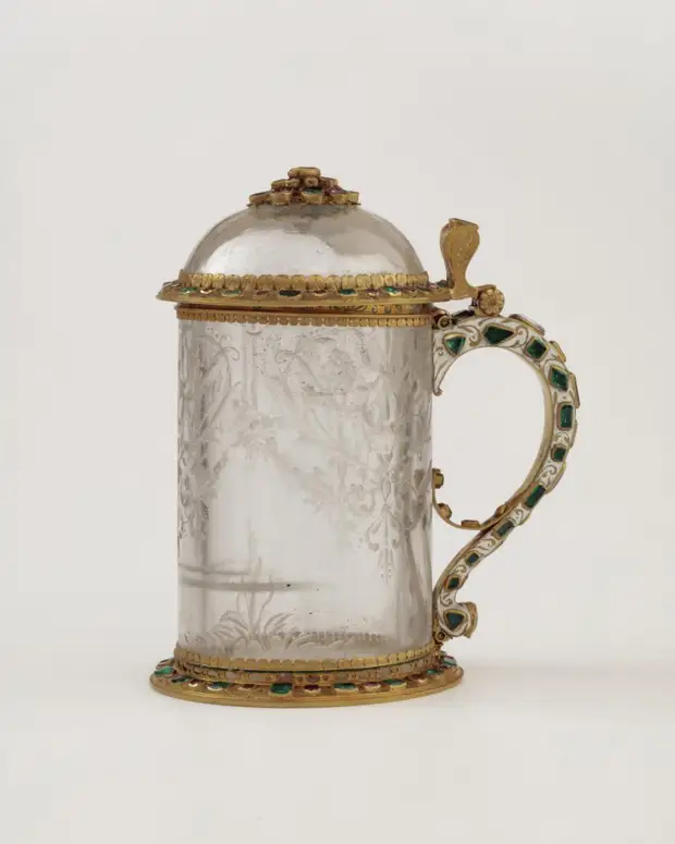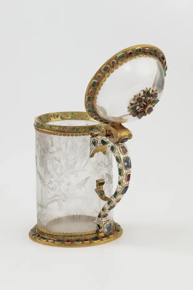 Кружка с открывающейся крышкой. Горный хрусталь, оправа из золота, украшенная изумрудами, рубинами, сапфирами и эмалью. Высота 14 см. Подражание стилю барокко. И хоть это не украшение, а утилитарный предмет, но он имеет отношения к камням.
