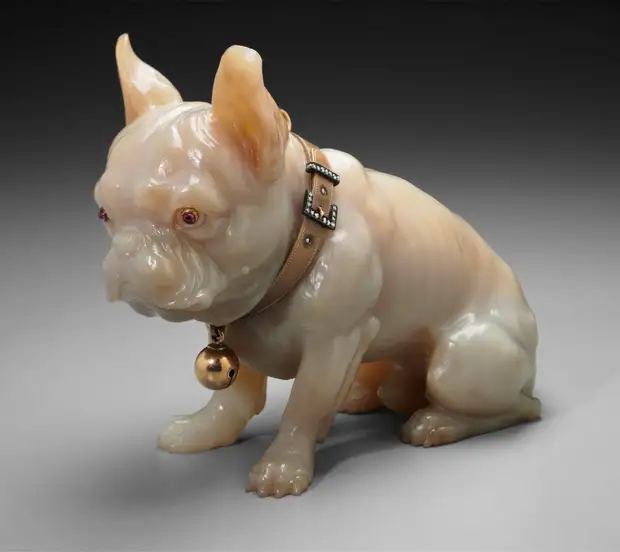 Фигурка бульдога из агата, украшенная золотом, рубинами и бриллиантами. Фирма Карла Фаберже. Нефритовая фигурка в форме нэцкэ, подражание стилистике китайских львов-стражей. Фирма Карла Фаберже. Камея «Мессалина с детьми». Сардоникс. Оправа: золото и эмаль, добавлена в XVII веке.