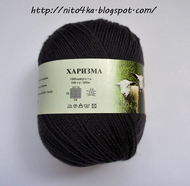 Для наколенников использовала вот такую пряжу "Харизма", по составу 100% шерсть. На один наколенник ушел почти целый моток ниток, а второй - будет для второго наколенника: