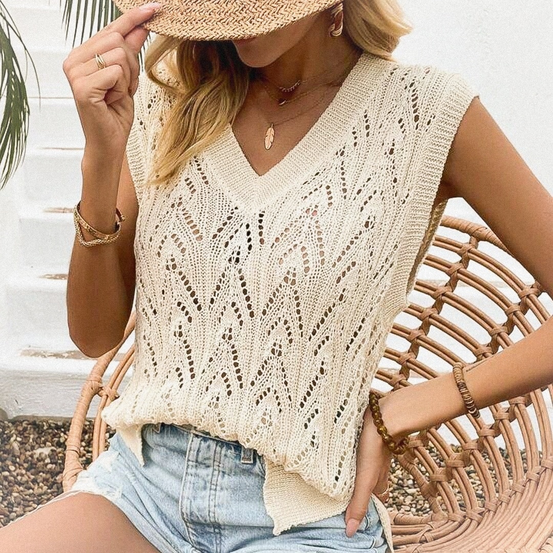 Летний ажурный топ с треугольным вырезом горловины, выполненный мотивами в виде аккуратных ажурных листьев по всей площади изделия.
