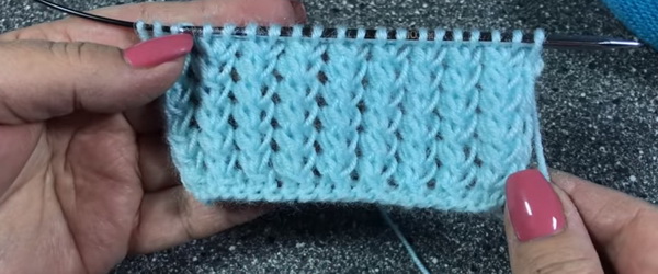 Убавки делаем с двух сторон от выделенных 9 петель в каждом ряду: две петли вместе провязываем изнаночной. Для примера первый ряд с убавками провязываем следующим образом: 9 петель резинки (начиная и заканчивая лицевой), две петли вместе изнаночной 29 петель по рисунку, две петли вместе изнаночной, 9 петель резинки (начиная и заканчивая лицевой), две петли вместе изнаночной 29 петель по рисунку, две петли вместе изнаночной. И так далее убавляем по 4 п в каждом ряду пока на спицах не останется 20 п. Макушку можно просто стянуть, а можно сшить более хитро. Этот способ актуален при вязании аналогичной более широкой «лопатки» на 15-17 петель, например. Для этого разделить петли резинки на две части: лицевые петли на одну, изнаночные на другую (спицы на леске), потом сшить иглой сначала петли верхней части, а затем продеть иглу вовнутрь и соединить петли нижней части.
