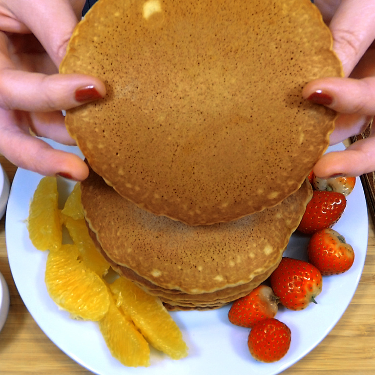 Этого количества хватает, чтобы напечь 7-8 блинчиков размером около 15 см. Блинчики очень пухлые.