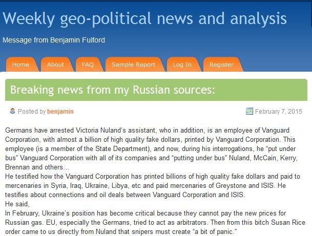 Немцы арестовали помощника Виктории Нуланд, который является и сотрудником Vanguard Corporation, по делу о «миллиарде высококачественных поддельных долларов», отпечатанных в Vanguard Corporation. Этот сотрудник во время допросов "уложил под автобус" («сдал») Vanguard Corporation со всеми его компаниями, а также Маккейна, Нуланд, Керри, Бреннана и других...