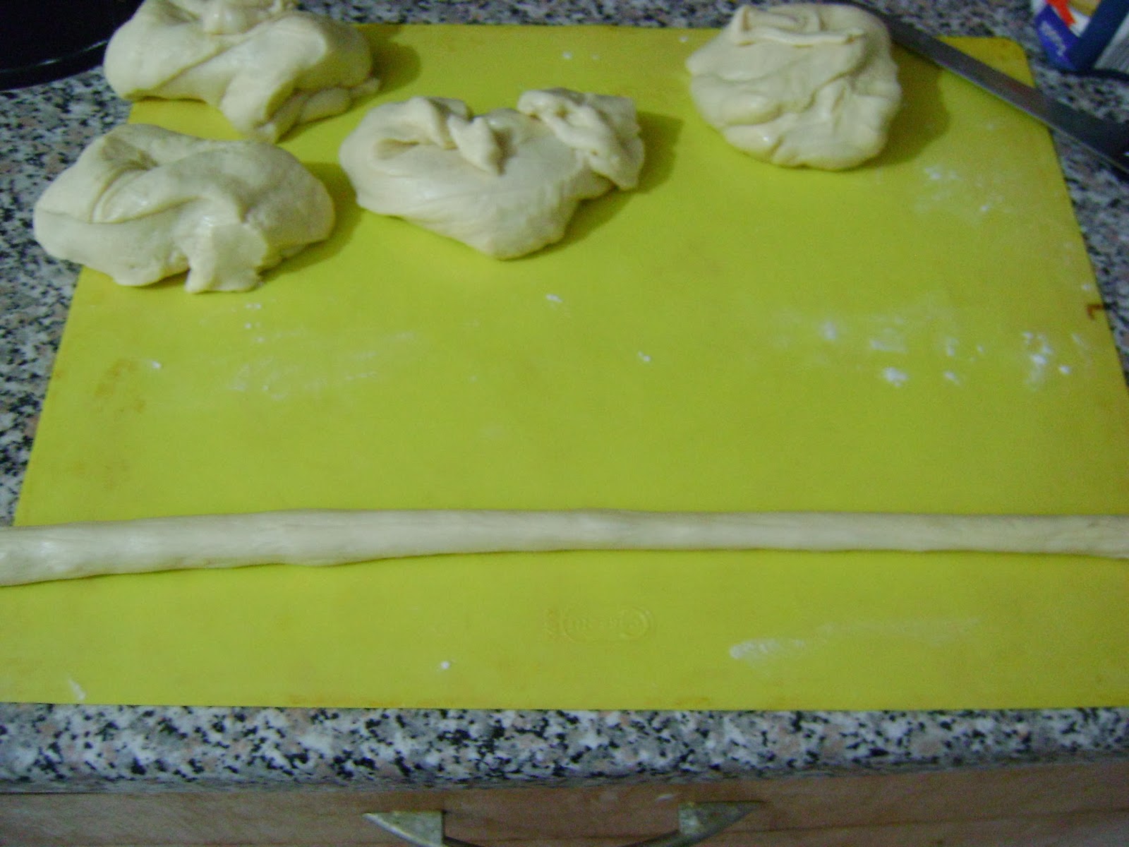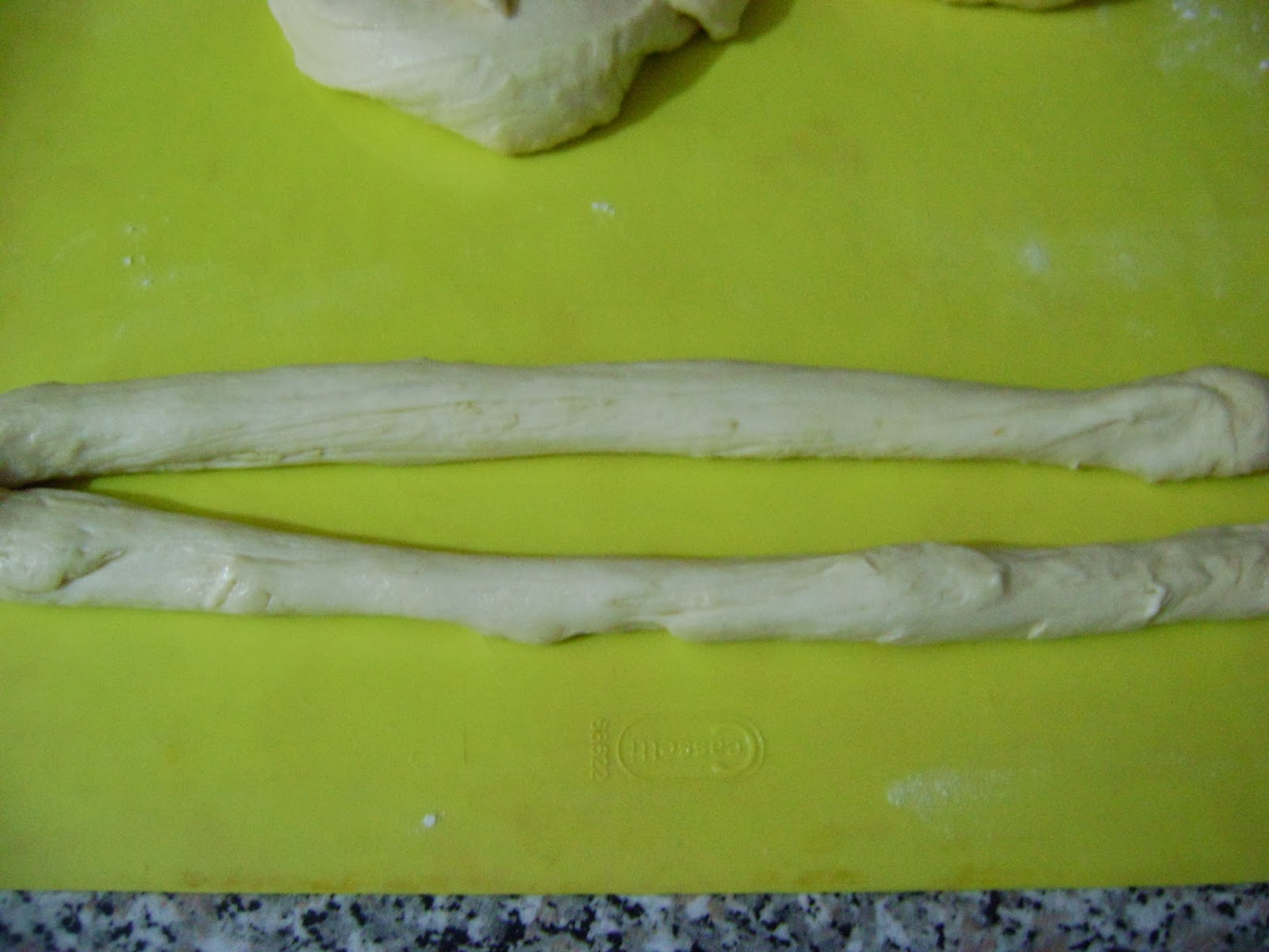 Накручиваем тесто на палочку, смазанную маслом, оставляя примерно 2-3 см ненакрученными. |