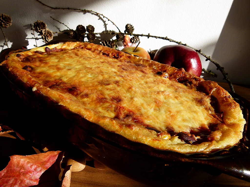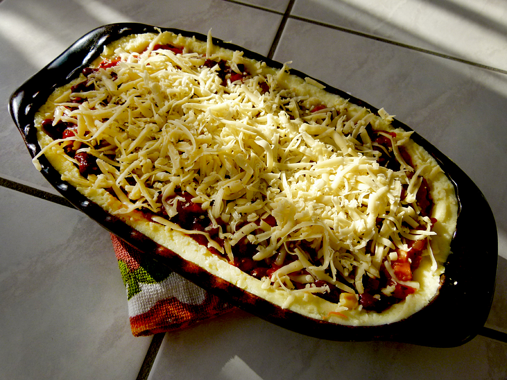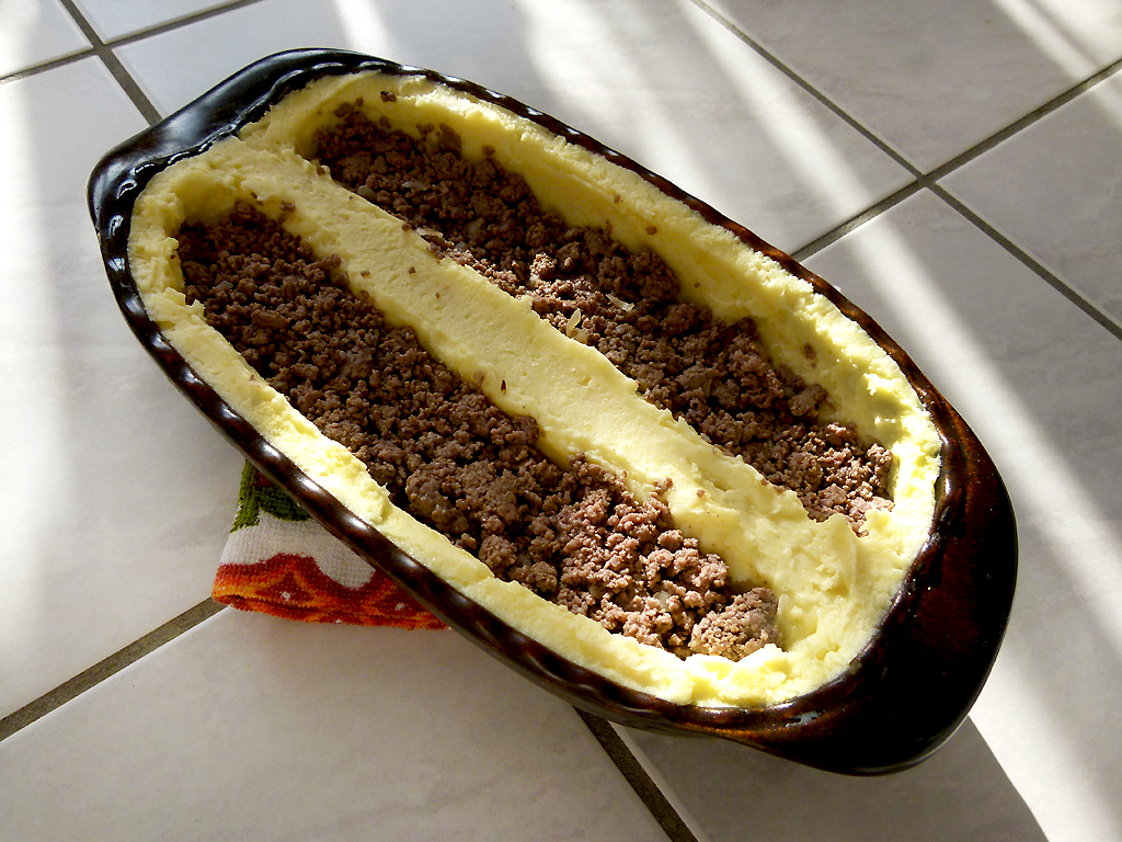 Това беше като начало. Сега пържим другата половина от лука с каймата. Добавяме една нотка вкус с кимиона и черен пипер, солим и се захващаме с пюрето.
