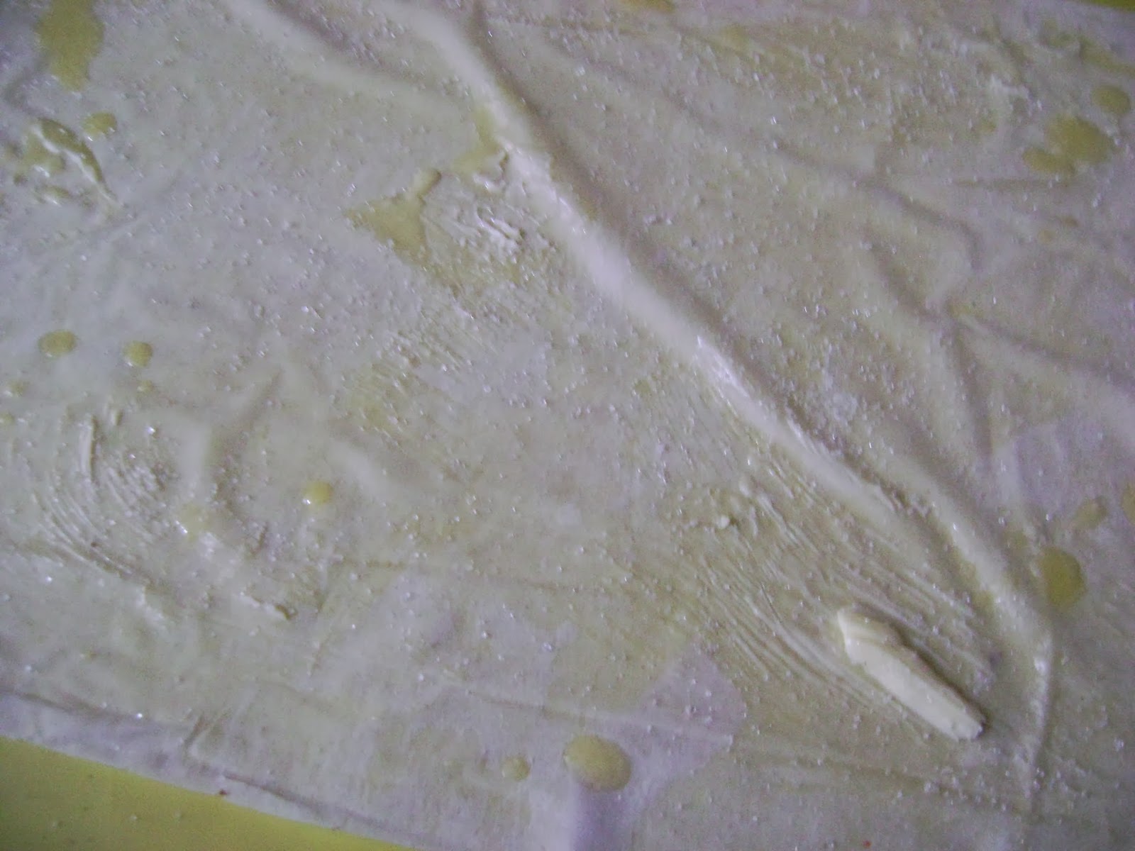 Берем лист теста, кладем его узкой стороной к себе и смазываем его маслом. Если хотим сделать тарталетку поменьше, то просто разрезаем тесто на 2 куска по середине по широкой его стороне. |