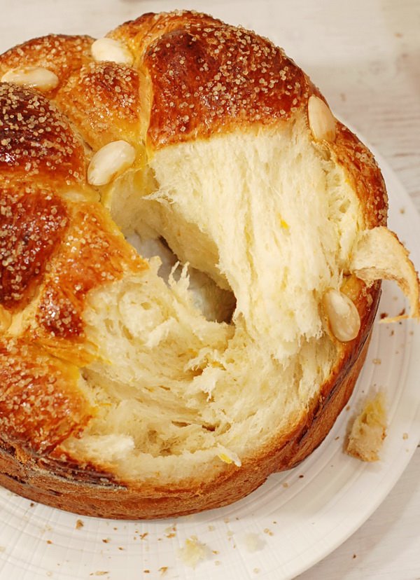 Изсипете брашното в купа за месене, направете вдлъбнатина в средата и излейте в него шупналата мая. Прибавете останалите продукти и замесете меко, гладко тесто. Ако е необходимо (зависи от брашното ви), добавете още малко мляко. Сложете готовото тесто в голяма купа с капак или го покрийте с пластично фолио и го оставете на топло да втасва, докато удвои обема си.