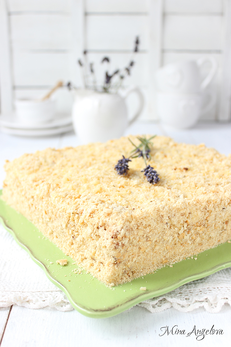 Готовата торта се оставя да се охлади и се прибира в хладилник за няколко часа. След това се обръща в широка чиния или друг плосък съд. |