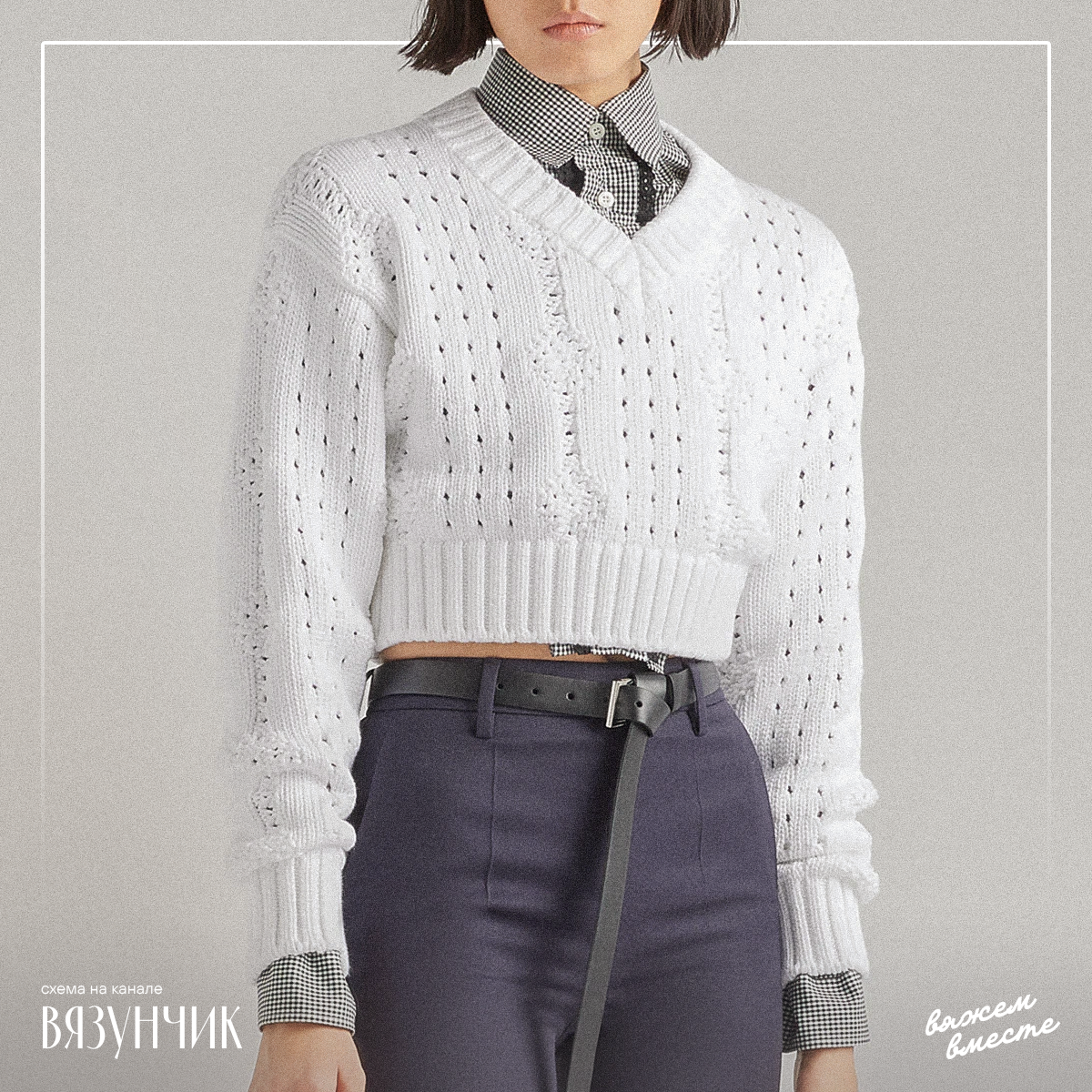 Не все разъезжаются по отпускам и дачам в теплый летний период. Для тех, кто остается в городе, возможно, даже трудится, я предлагаю присмотреться к красивому и лаконичному джемперу с коротким рукавом.