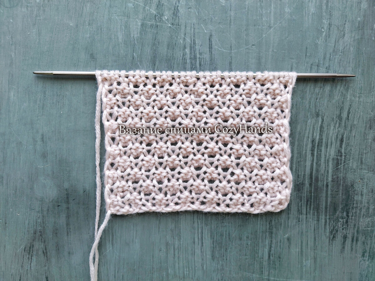 Образец ниже связан из пряжи 100% мериносовой шерсти. В таком виде узор подойдет для вязания свитеров, джемперов, кардиганов, шапок на весну.