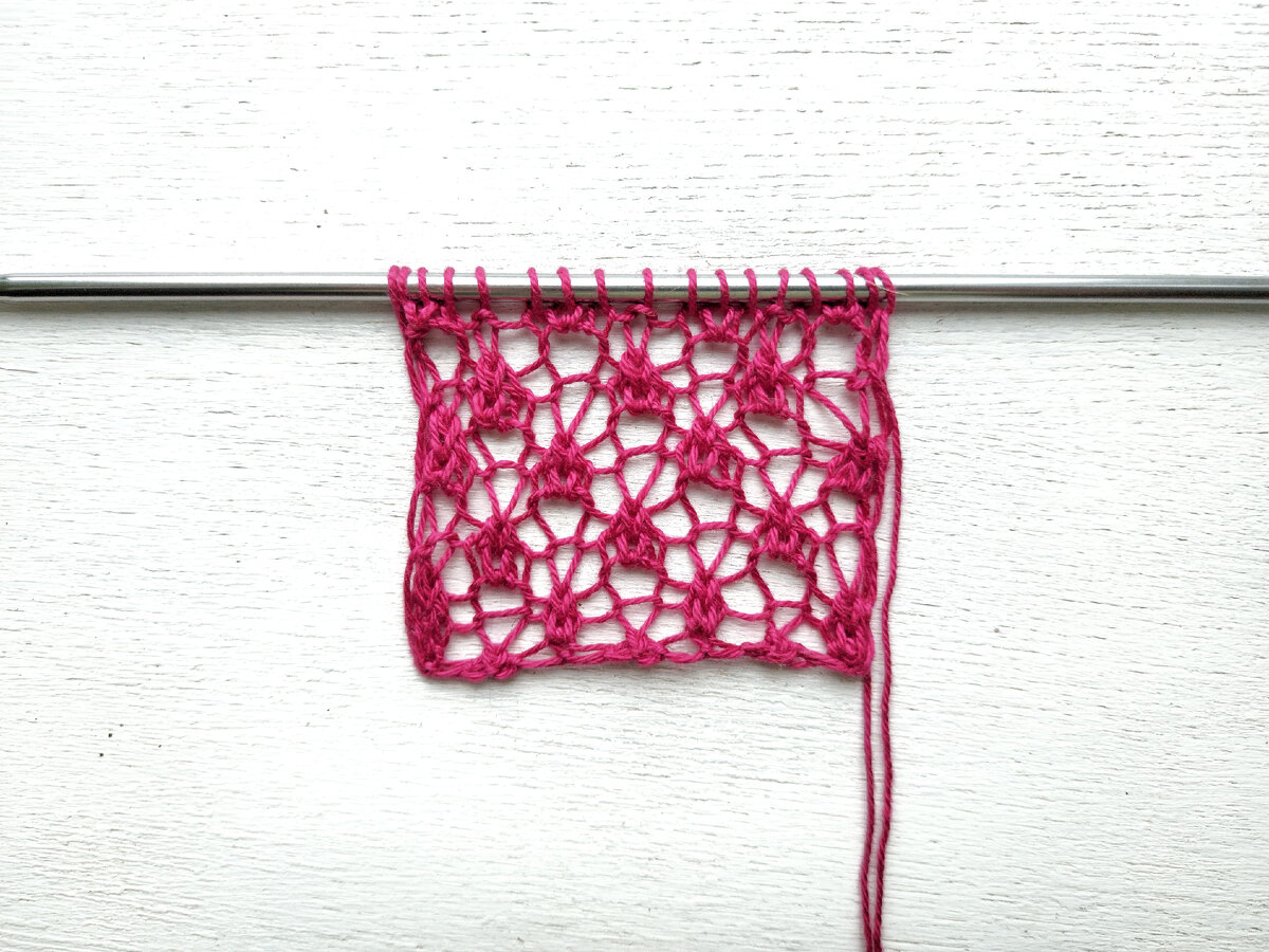 Следующий образец связан из тонкого мерсеризированного хлопка на крупных спицах. Здесь полотно уже выглядит как сеточка с шишибриками. Узором в таком варианте можно связать сарафаны, туники, палантины, топы.